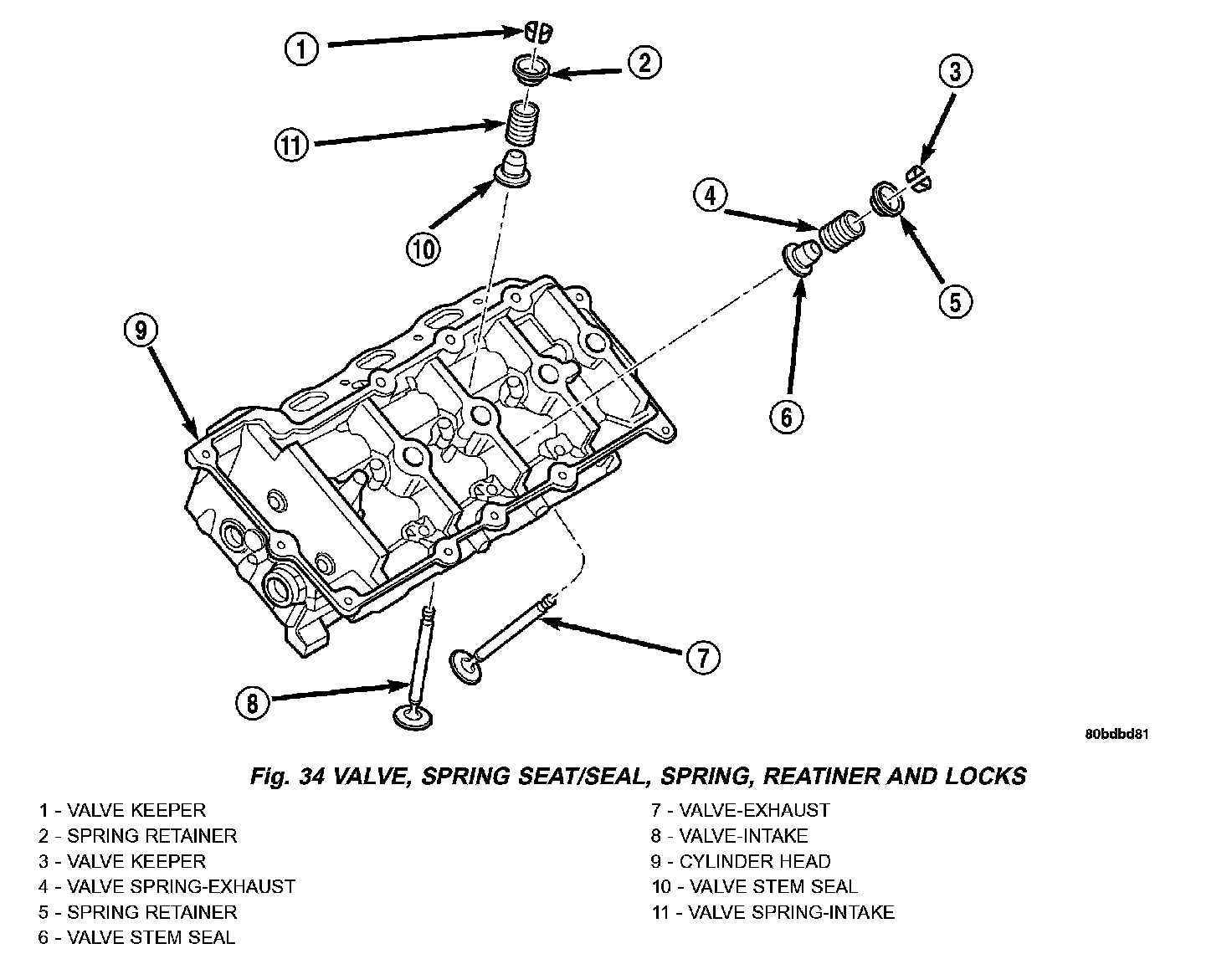 2. Remove valve retaining locks, valve spring retainers, valve springs and valve spring seat/stem seal assembly (Fig. 34).
