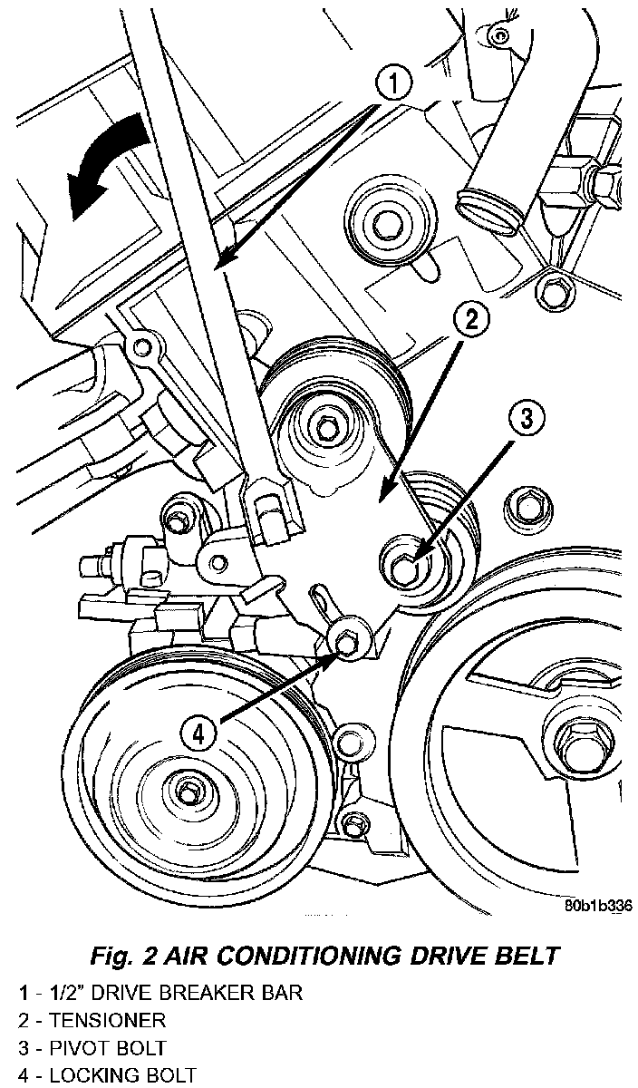 3. Insert 1/2" drive breaker bar into square opening on belt tensioner. Rotate tensioner counterclockwise until belt can be removed from pulleys (Fig. 2).