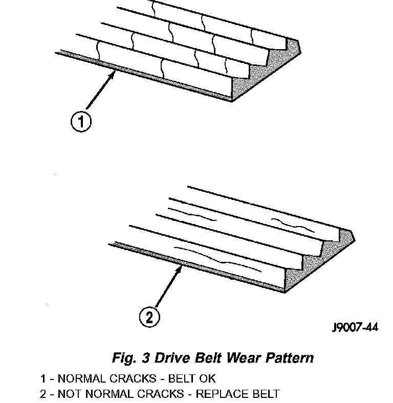 Poly-V Belt system may develop minor cracks across the ribbed side (due to reverse bending). These minor cracks are considered normal and acceptable. Parallel cracks are not (Fig. 3).