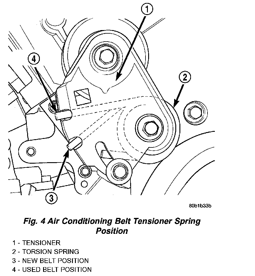 NOTE: Verify that torsion spring position is in the new belt position before installing a NEW belt (Fig. 4). If torsion spring is not in the new belt position, follow steps 1-7 to change the tensioner spring from the USED belt position to the NEW belt position.