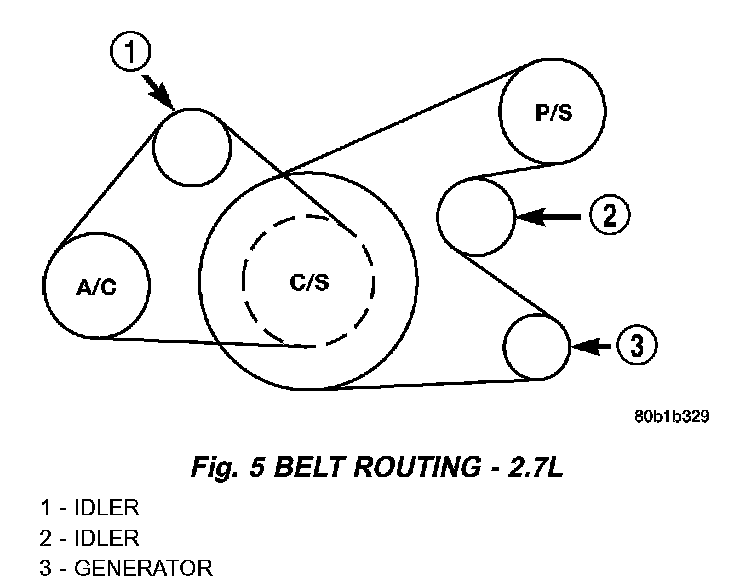 8. Install the NEW belt by rotating the tensioner counterclockwise until the NEW belt can be installed on pulleys. See (Fig. 5) for belt routing.