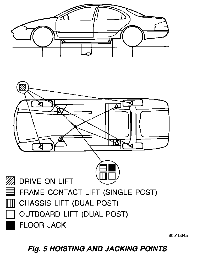 WARNING: THE HOISTING AND JACK LIFTING POINTS PROVIDED ARE FOR A COMPLETE VEHICLE. WHEN THE ENGINE OR REAR SUSPENSION IS REMOVED FROM A VEHICLE, THE CENTER OF GRAVITY IS ALTERED MAKING SOME HOISTING CONDITIONS UNSTABLE. PROPERLY SUPPORT OR SECURE VEHICLE TO HOISTING DEVICE WHEN THESE CONDITIONS EXIST.