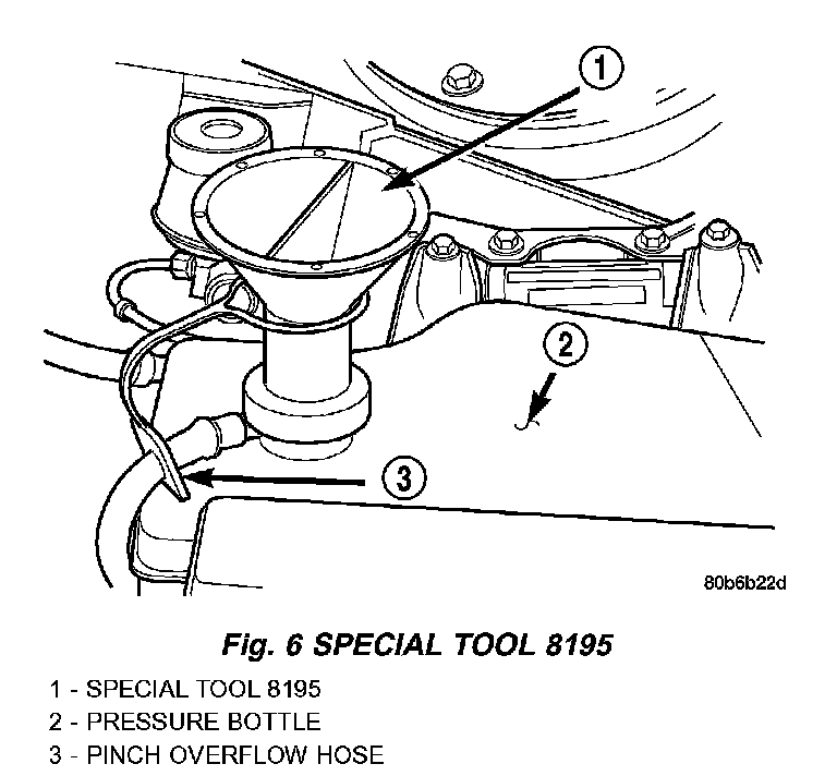 13. Remove Special Tool 8195, Filling Aid Funnel. Install cap on coolant pressure bottle.