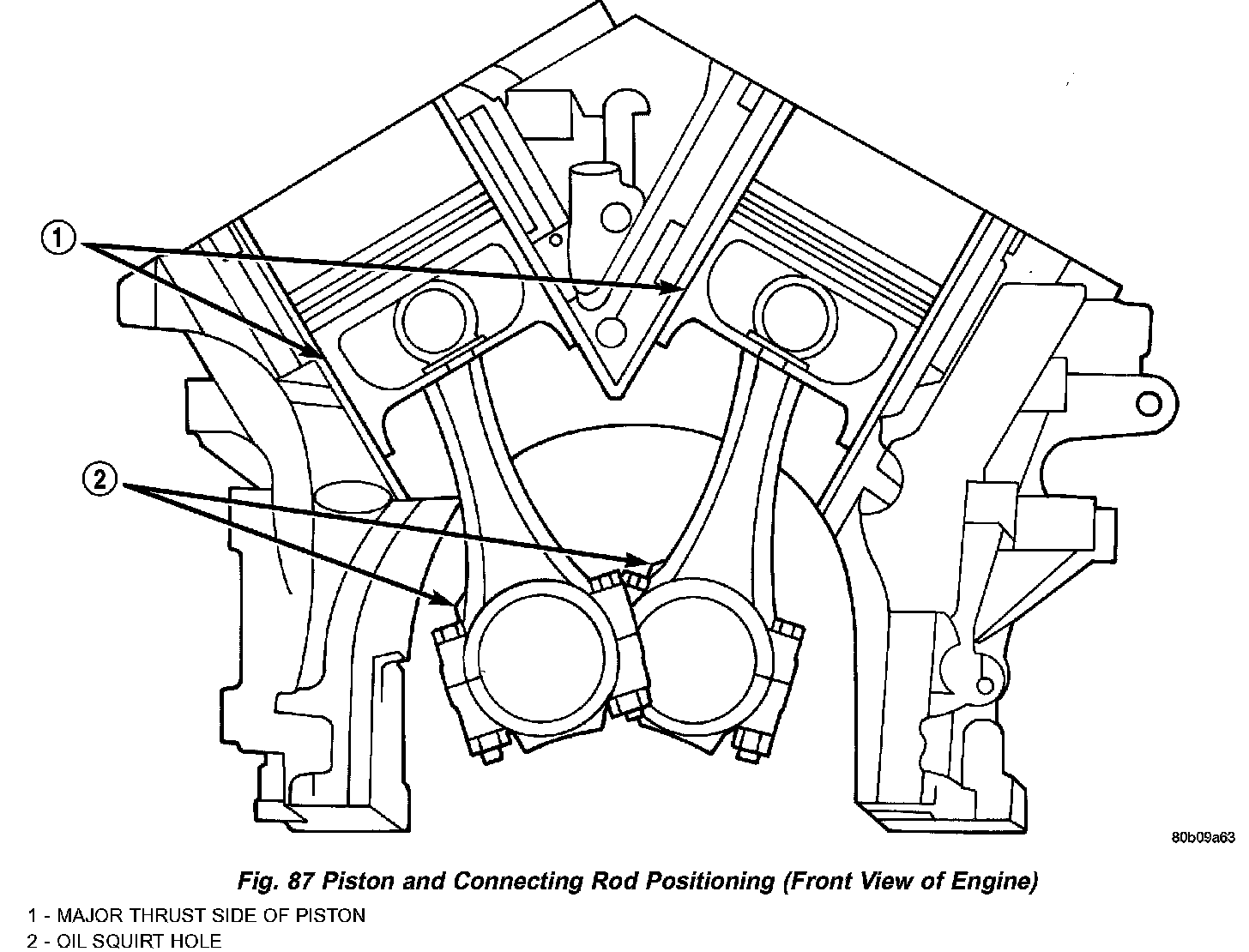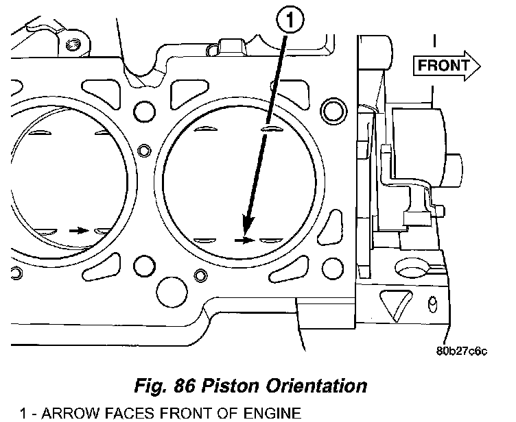 7. The arrow on top of piston must be pointing toward front of engine (Fig. 86) and oil squirt hole on connecting rod faces the major thrust (right) side of the cylinder bore (Fig. 87).