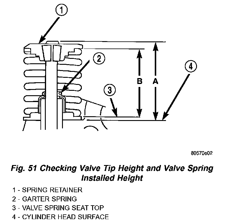 4. Compress valve spring with valve spring compressor. Install locks and release tool. If valves and/or seats are reground, measure the installed height of springs (B) (Fig. 51), make sure measurements are taken from top of spring seat to the bottom surface of spring retainer. If height is greater than 38.75 mm (1.5256 inch), install a 0.762 mm (0.030 inch) spacer in head counterbore under the valve spring seat to bring spring height back within specification.