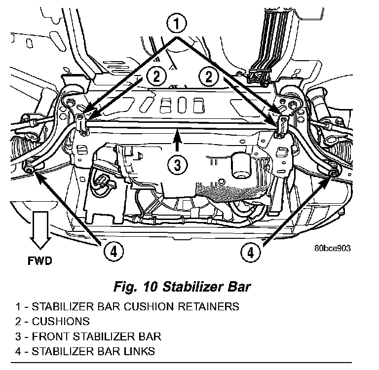 4. Remove the stabilizer bar cushion retainer bolts and retainers (Fig. 10), and remove the stabilizer bar with cushions attached from the vehicle.