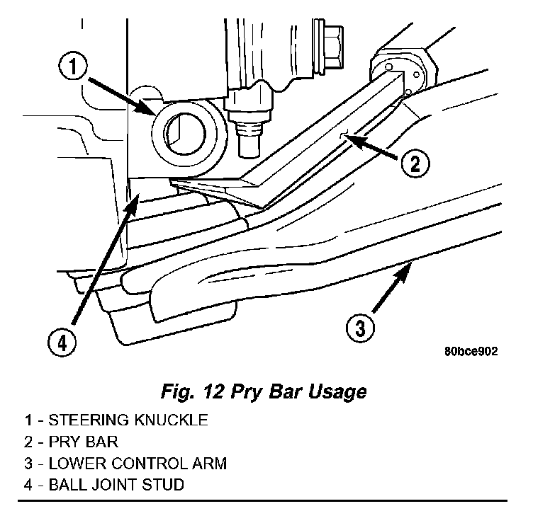 6. Separate each ball joint stud from the steering knuckle by prying down on lower control arm and up against the ball joint boss on the steering knuckle (Fig. 12).