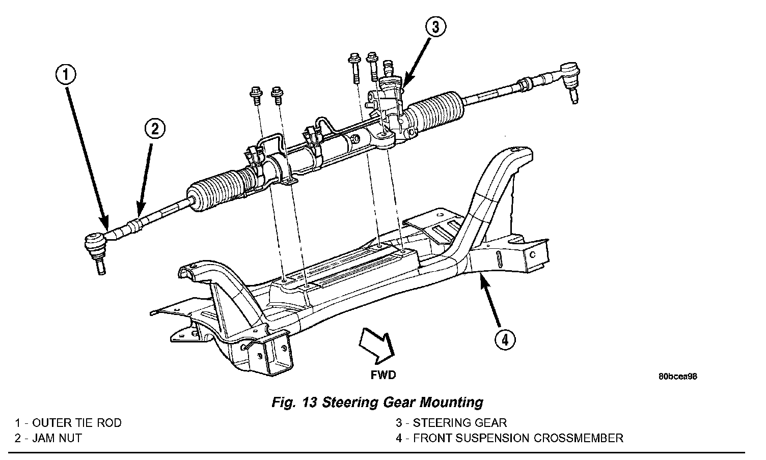 6. Attach the steering gear to the front suspension crossmember (Fig. 13). Install the four power steering gear mounting bolts. Tighten the mounting bolts to a torque of 61 N.m (45 ft.lbs.).
