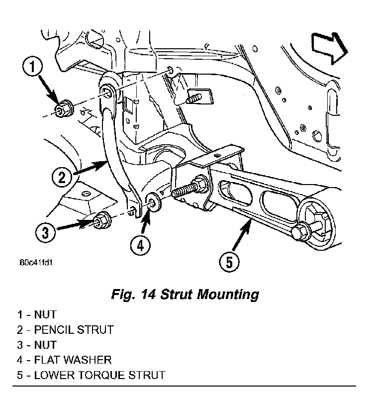 11. Remove the pencil strut from the right front corner of the crossmember and body of the vehicle (Fig. 14). Remove the washer behind the strut from the torque strut bolt.
