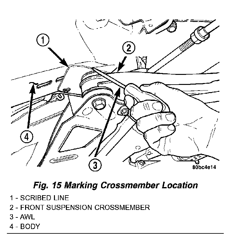 13. Using an awl, scribe a line (Fig. 15) marking the location of where the front suspension crossmember is mounted against the body of the vehicle.