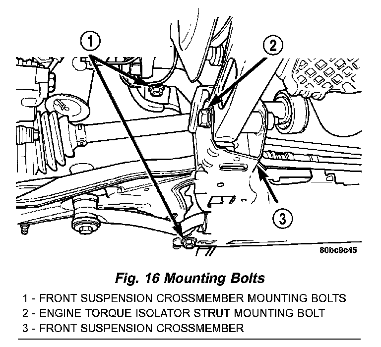3. Start the two rear crossmember mounting bolts into the tapping plates mounted in the body. The right side bolt can be viewed in the mounting bolt figure (Fig. 16). The left side bolt is located in the same location on the other side of the vehicle. Next, install the two front mounting bolts attaching front suspension crossmember to frame rails of vehicle. Lightly tighten all four mounting bolts to a approximately 2 N.m (20 in.lbs.) to hold the front suspension crossmember in position.