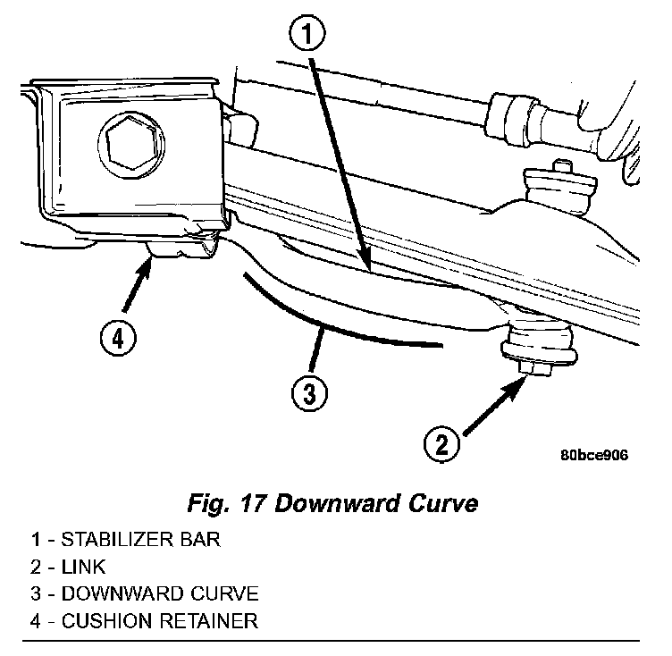 NOTE: Before installing the stabilizer bar, make sure the bar is not upsidedown. The stabilizer bar must be installed with the curve on the outboard ends of the bar facing downward to clear the control arms once fully installed (Fig. 17).