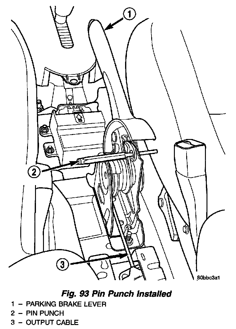 5. Grasp the parking brake lever output cable by hand and pull upward. Continue pulling on the cable until a pin punch can be inserted through the hole in the lever mechanism sector gear and the hole in the right side of its mounting bracket. This will lock the parking brake automatic adjustment mechanism in place and take tension off the parking brake cables.