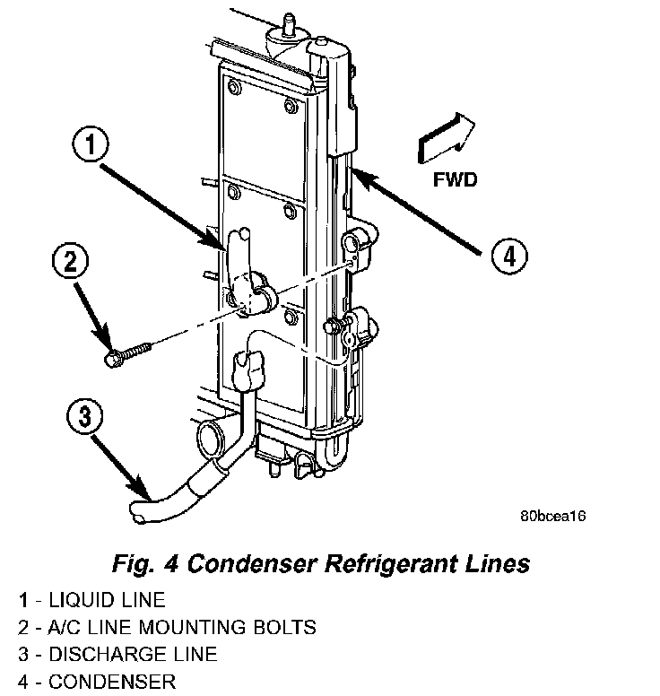 The condenser is located in front of the engine radiator. It has no serviceable parts. If damaged or leaking, the condenser assembly must be replaced.