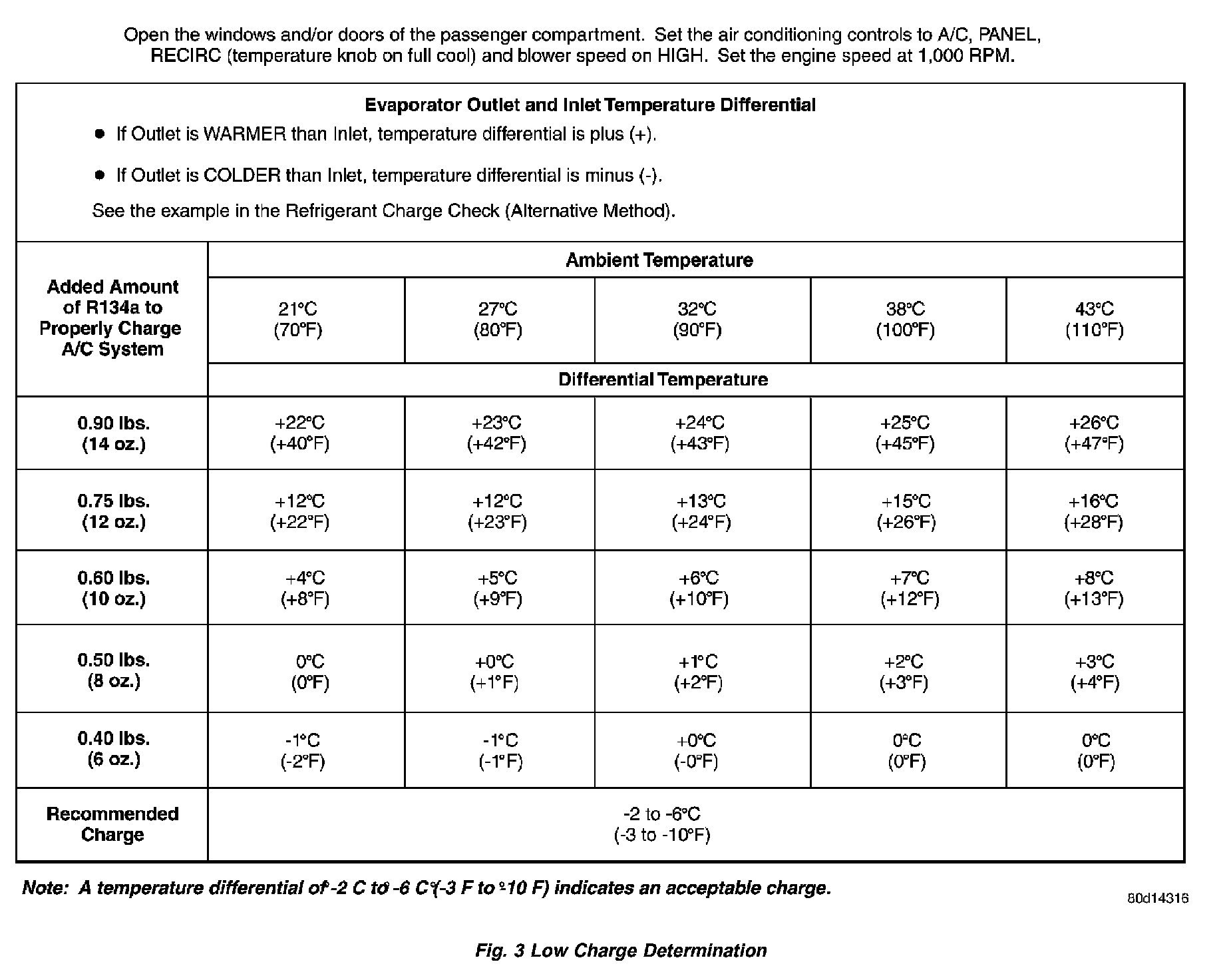 11. EXAMPLE: The ambient temperature is 21 °C (70 °F). The evaporator inlet tube temperature is 12 °C (54 °F) and the evaporator outlet tube temperature is 10 °C (50 °F). Subtract the inlet tube temperature from the outlet tube temperature. The difference is -2 °C (-4 °F). With a -2 °C (-4 °F) temperature differential at 21 °C (70 °F) ambient temperature, the system is fully charged.