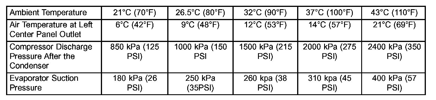 6. With the A/C clutch engaged, compare the discharge air temperature to the A/C Performance Temperatures chart.