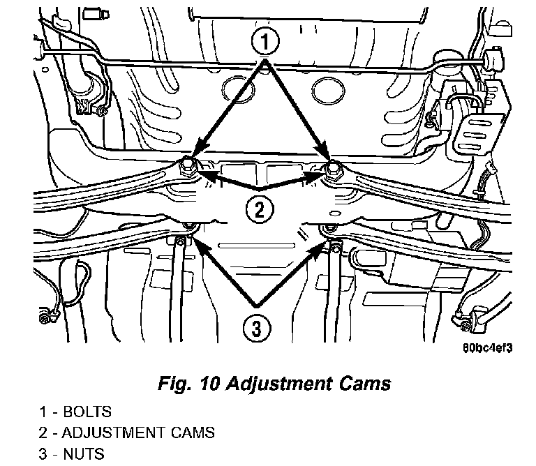 3. While holding the toe adjustment cams from turning, tighten the attaching bolt nuts. This will securely hold the adjustment cams in position. Tighten the attaching bolt nuts to a torque of 88 Nm (65 ft. lbs.).