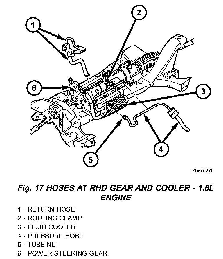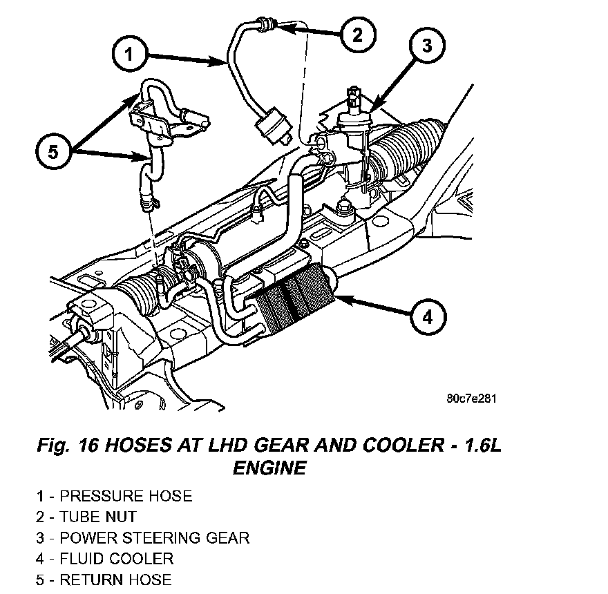 INSTALLATION-1.6L ENGINECAUTION: The power steering fluid hoses must remain away from the exhaust system, vehicle components, and unfriendly surfaces that can cause possible damage to the power steering hoses.