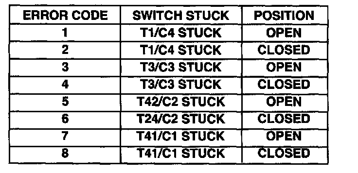 Theory of Operation: The C1 through C4 (T1, T3, T41, and T42) sense circuits communicate the shift lever position to the TCM. Each circuit is terminated at the transmission with a switch. Each switch can be either open or closed, depending on the shift lever position. The TCM can decode this information and determine the shift lever position. Each shift lever position has a certain combination of switches which will be open and closed, this is called a PRNDL code. There are 4 switches, therefore: there are many possible combinations of open and closed switches (codes). However, there are only 9 valid codes (8 for AutoStick), one for each gear position and three recognized between gear codes. The remainder of the codes should never occur, these are called invalid codes. The chart shows the normal switch states for each shift lever position.