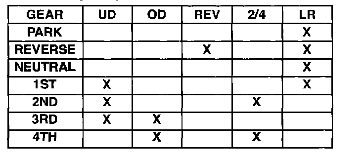 Theory of Operation: Four solenoids are used to control the friction elements (clutches). The continuity of the solenoids circuits are periodically tested. Each solenoid is turned on or off depending on it's current state. An inductive spike should be detected by the TCM during this test. If no spike is detected, the circuit is tested again to verify the failure. In addition to the periodic testing, the solenoid circuits are tested if a gear ratio or pressure switch error occurs. In this case, one failure will result in the appropriate code being set.