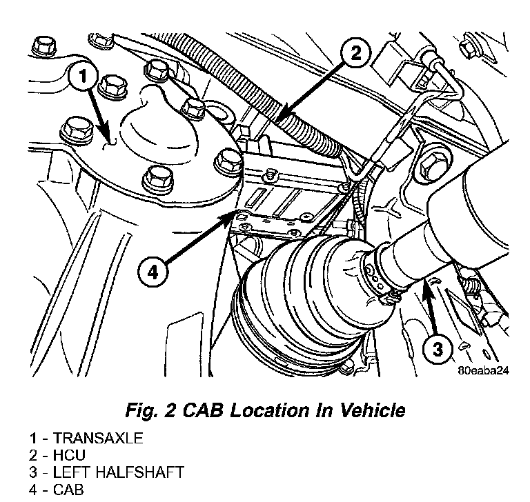 The CAB is mounted to the HCU as part of the Integrated Control Unit (ICU). Attached to the bottom of the HCU, it can be viewed from below, just above the transaxle and left halfshaft.