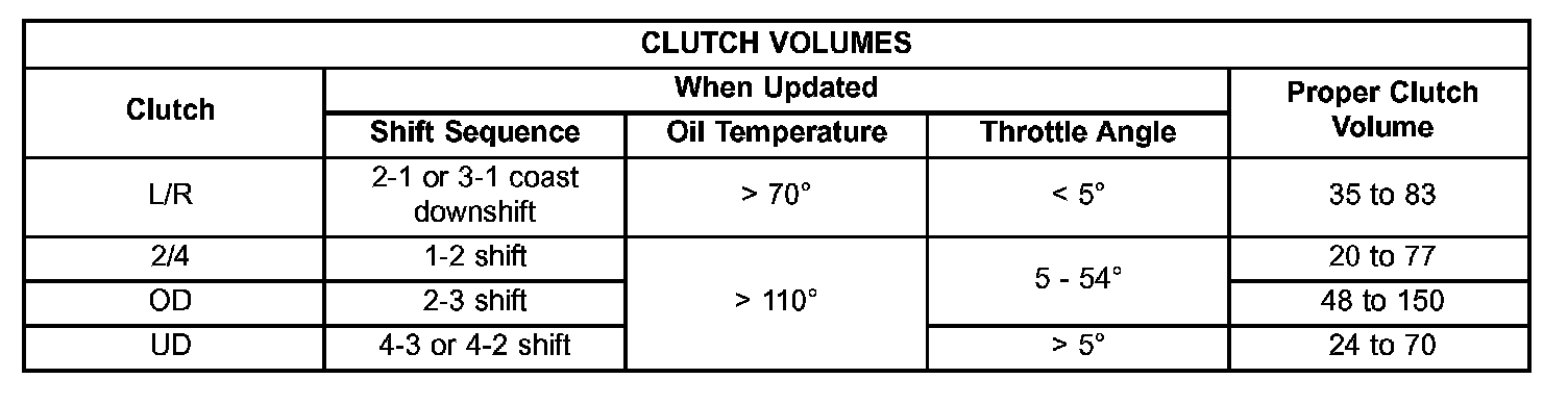 Certain mechanical problems within the clutch assemblies (broken return springs, out of position snap rings, excessive clutch pack clearance, improper assembly etc.) can cause inadequate or out-of-range clutch volumes. Also, defective Input/Output Speed Sensors and wiring can cause these conditions. The chart identifies the appropriate clutch volumes and when they are monitored/updated: