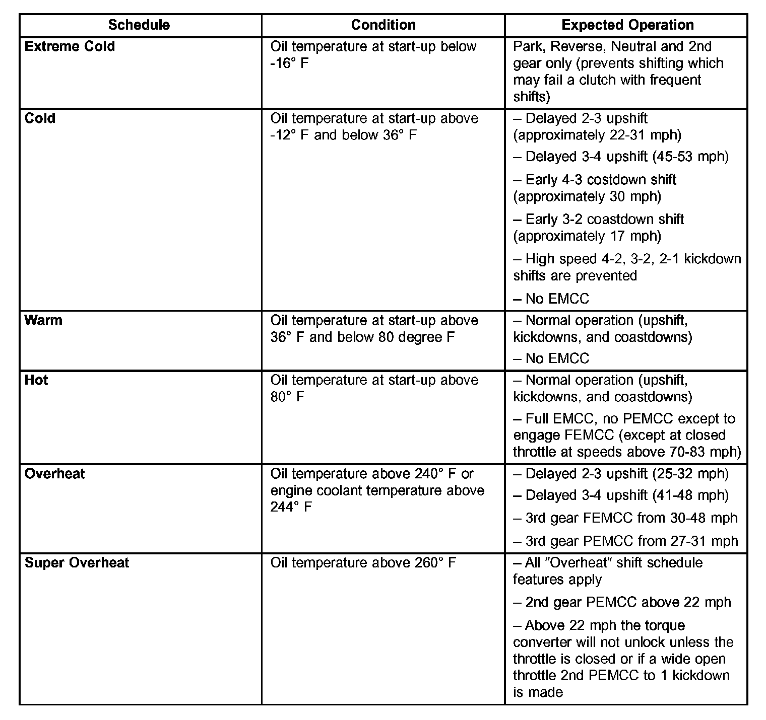 As driving conditions change, the TCM appropriately adjusts the shift schedule. Refer to the chart to determine the appropriate operation expected, depending on driving conditions.