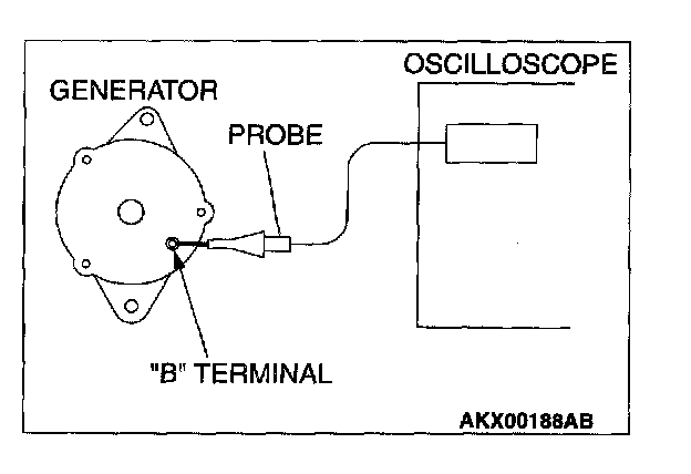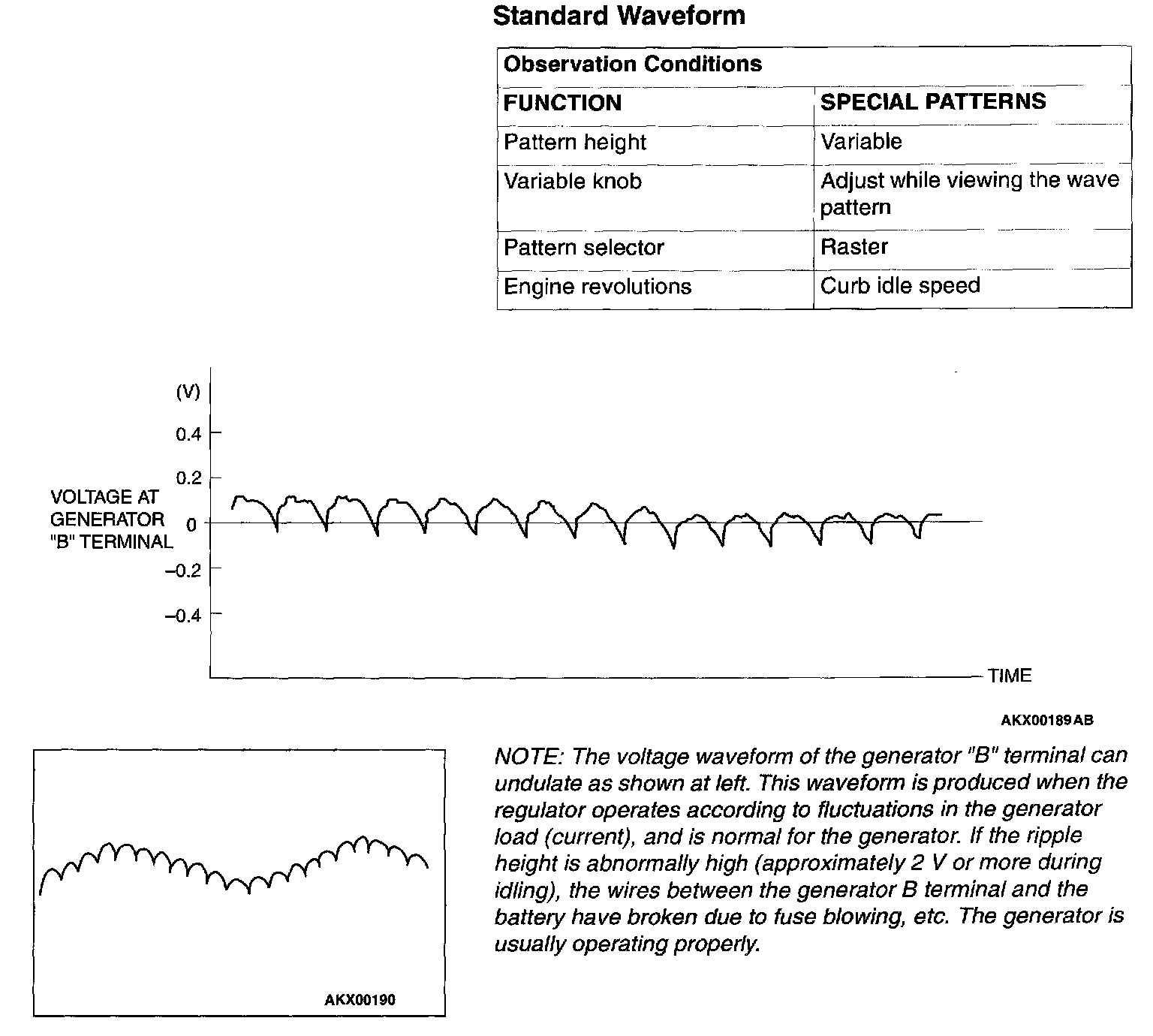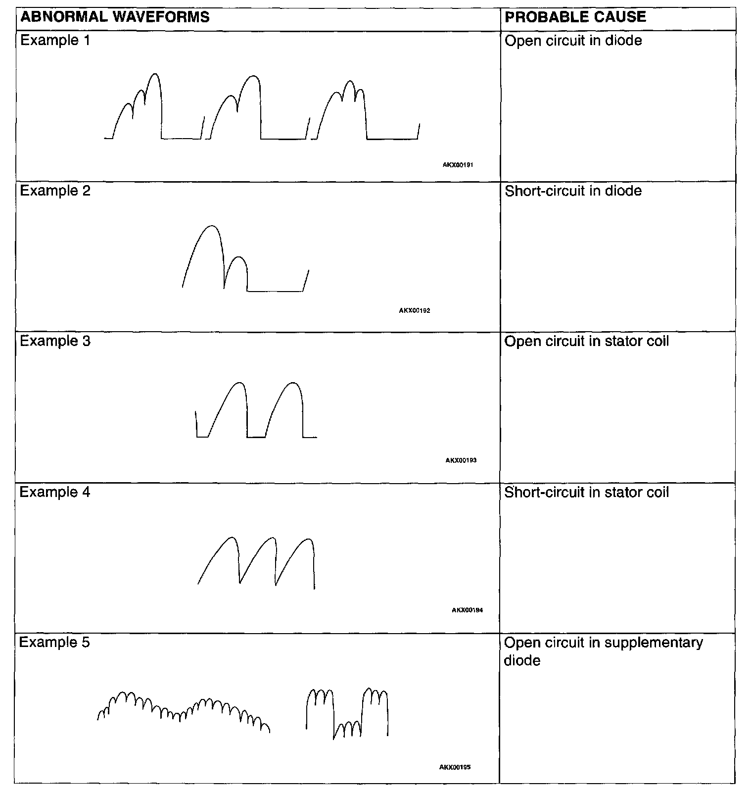 - Identification of abnormal waveforms is easier when there is a large output current (regulator is not operating). (Waveforms can be observed when the headlights are illuminated.)