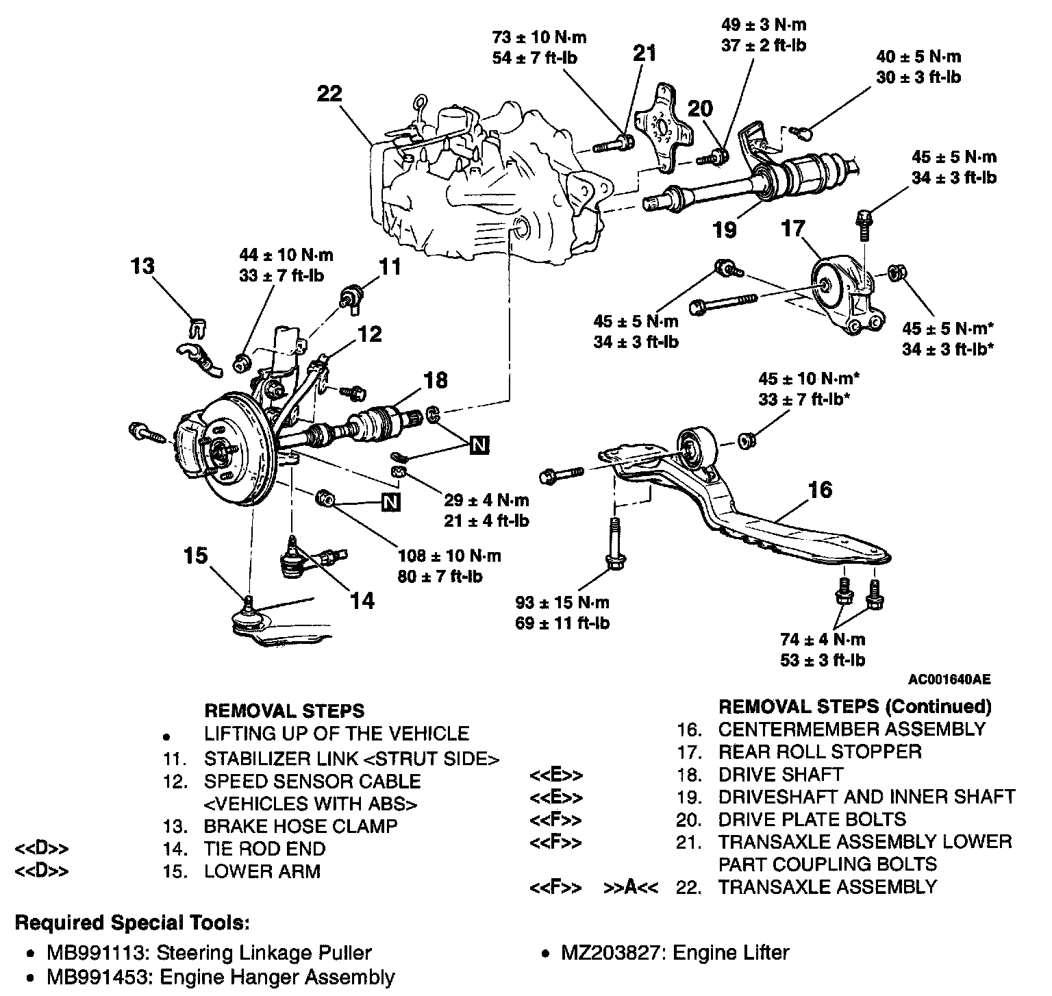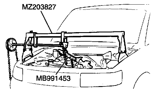 Set special tools MB991453 and MZ203827 to the vehicle to support the engine assembly.