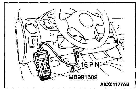 CAUTION: To prevent damage to scan tool MB991502, always turn the ignition switch to the "LOCK" (OFF) position before connecting or disconnecting scan tool MB991502.