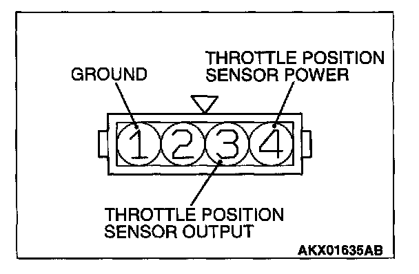 3. Connect an ohmmeter between terminals 1 (ground) and 3 (output), or between terminals 3 (output) and 4 (power). Then, make sure that the resistance changes smoothly when the throttle valve is slowly moved to the fully open position.