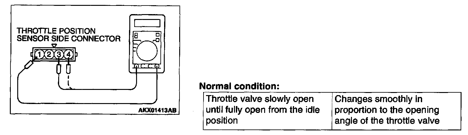 1. Disconnect the throttle position sensor connector and connect the test harness special tool (MB991348) in between. (All terminals should be connected.)