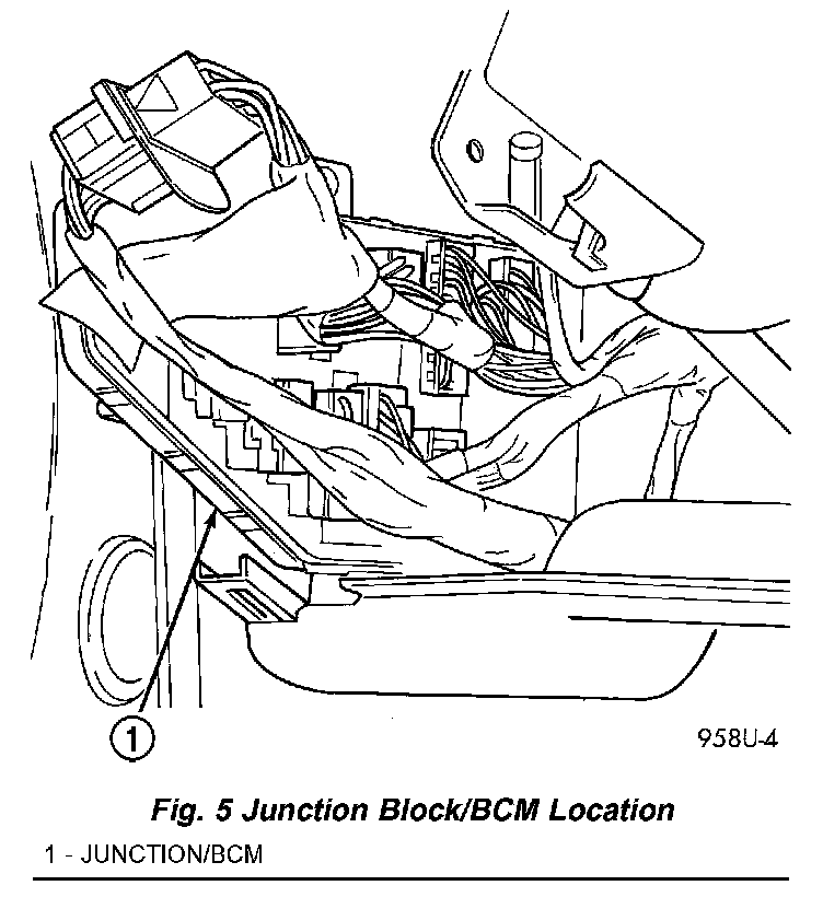 The Junction Block (JB) and Body Control Module (BCM) are attached to each other. After removal they can be separated. Junction Block and Body Control Module assemblies are located on the driver's side of the vehicle (Fig. 5).