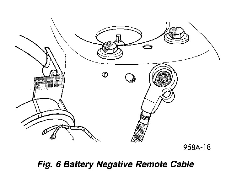 1. Open hood then disconnect and isolate the battery negative remote cable from the remote terminal on the left shock tower (Fig. 6).