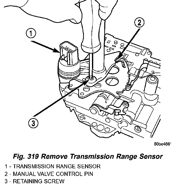 2. Remove transmission range sensor retaining screw and remove sensor from valve body (Fig. 319).