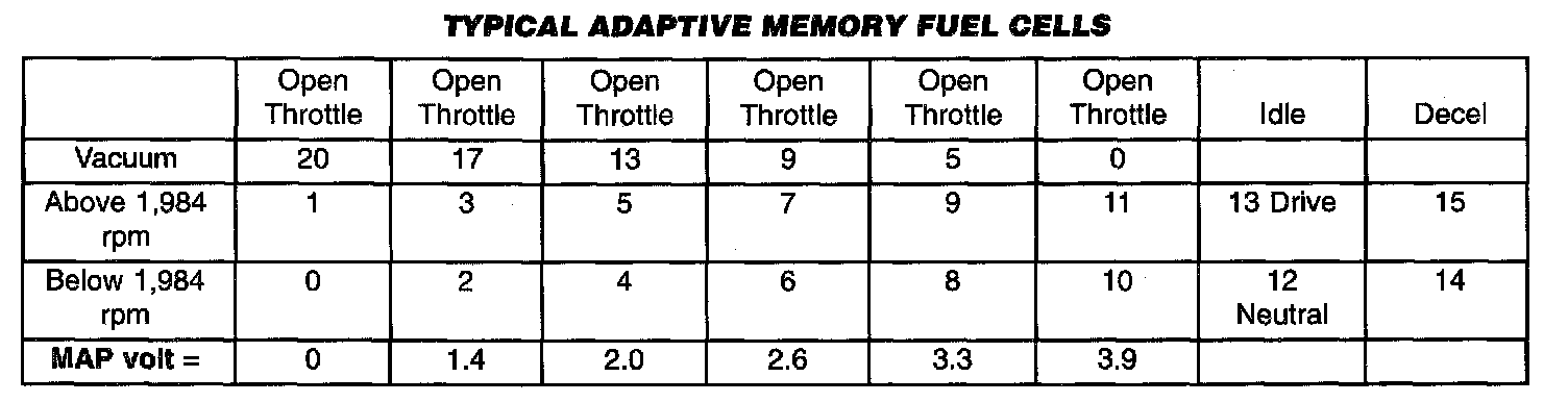 Ther number of cells varies upon the driving conditions. Two cells are used only during idle, based upon TPS and Park/Neutral switch inputs. There may be two other cells used for deceleration, based on TPS, engine rpm, and vehicle speed. The other twelve cells represent a manifold pressure and an rpm range. Six of the cells are high rpm and the other six are low rpm. Each of these cells is a specific MAP voltage range Typical Adaptive Memory Fuel Cells.