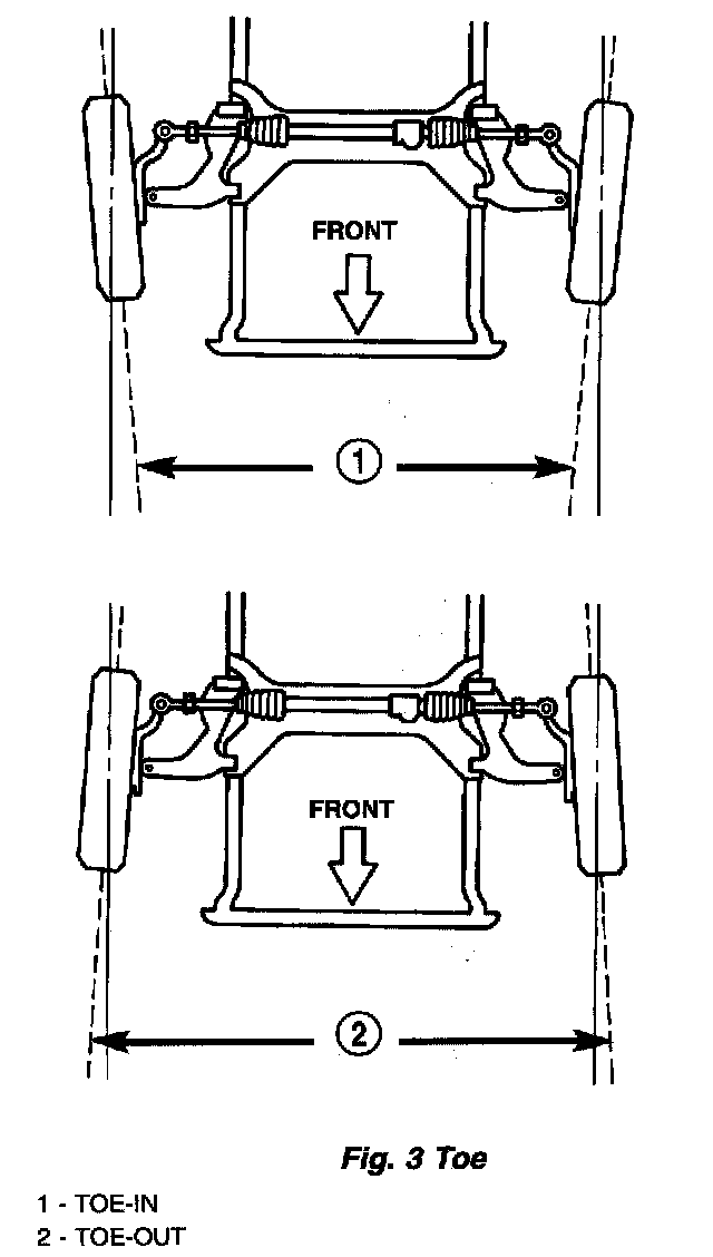 Dynamic toe pattern is the inward and outward toe movement of the front and rear tires through the suspension's jounce and rebound travel. As the vehicle's suspension moves up and down, the toe pattern varies. Toe pattern is critical in controlling the directional stability of the vehicle while in motion. Front and rear dynamic toe pattern is preset by the factory at the time the vehicle is assembled. It is not necessary to check or adjust front or rear dynamic toe pattern when doing a normal wheel alignment. The only time dynamic toe pattern needs to be checked or adjusted is if the frame of the vehicle has been damaged.