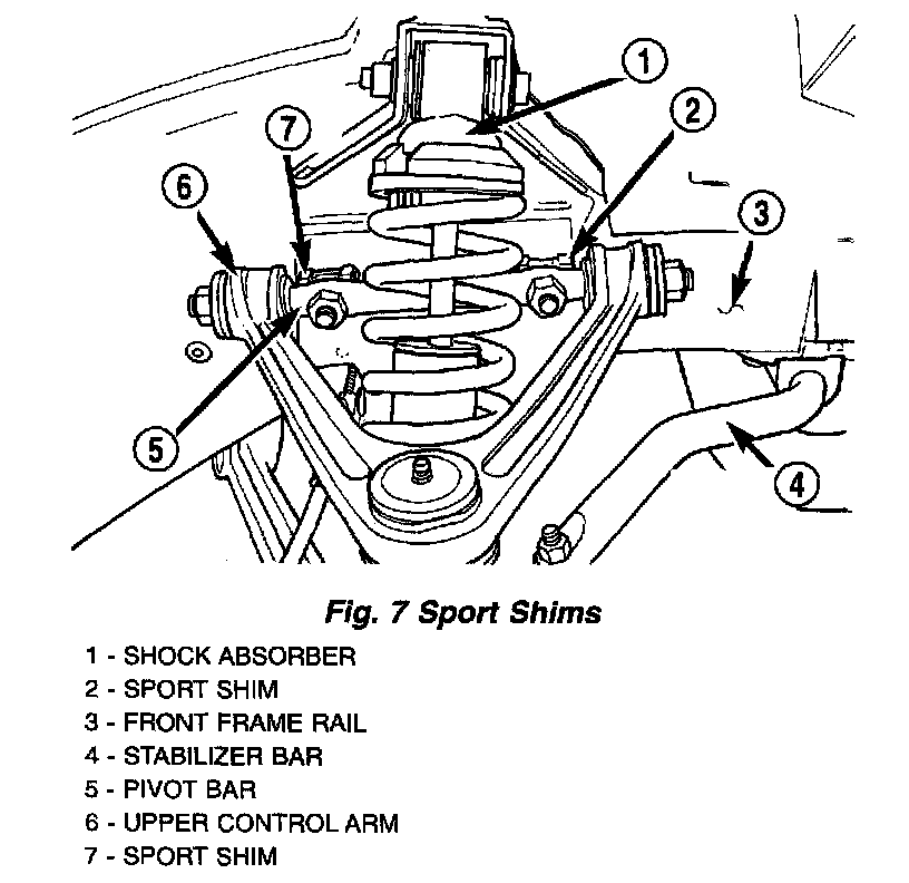 There are two sport shims used on each side of the vehicle's front suspension. There is one sport shim located at each of the front upper control arm pivot bar to frame attaching studs.