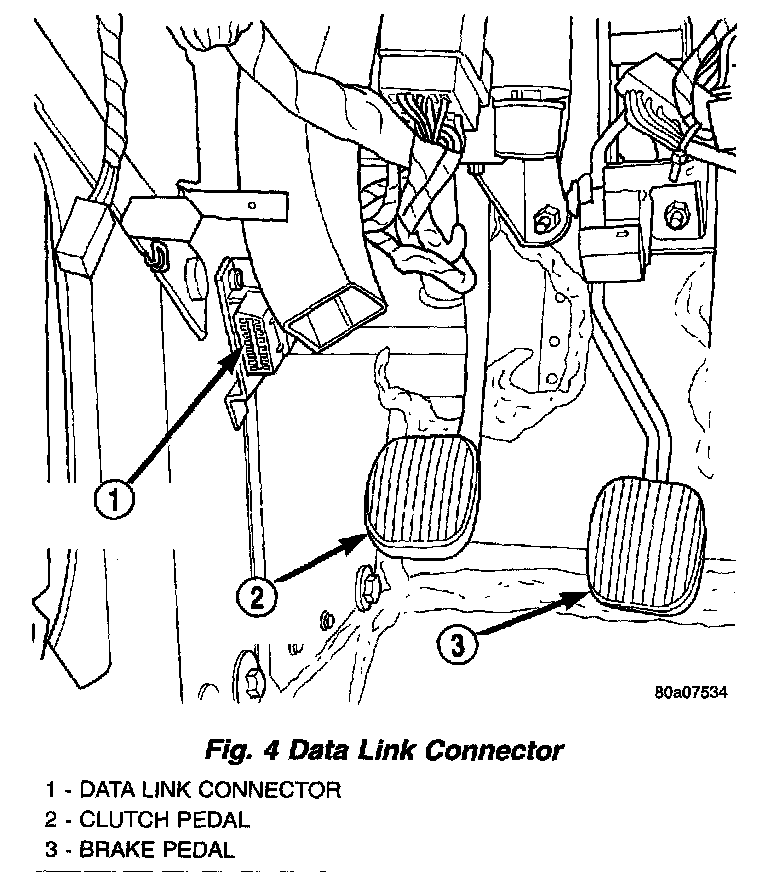 The data link connector is located inside the vehicle, below instrument panel to the left of the clutch pedal.