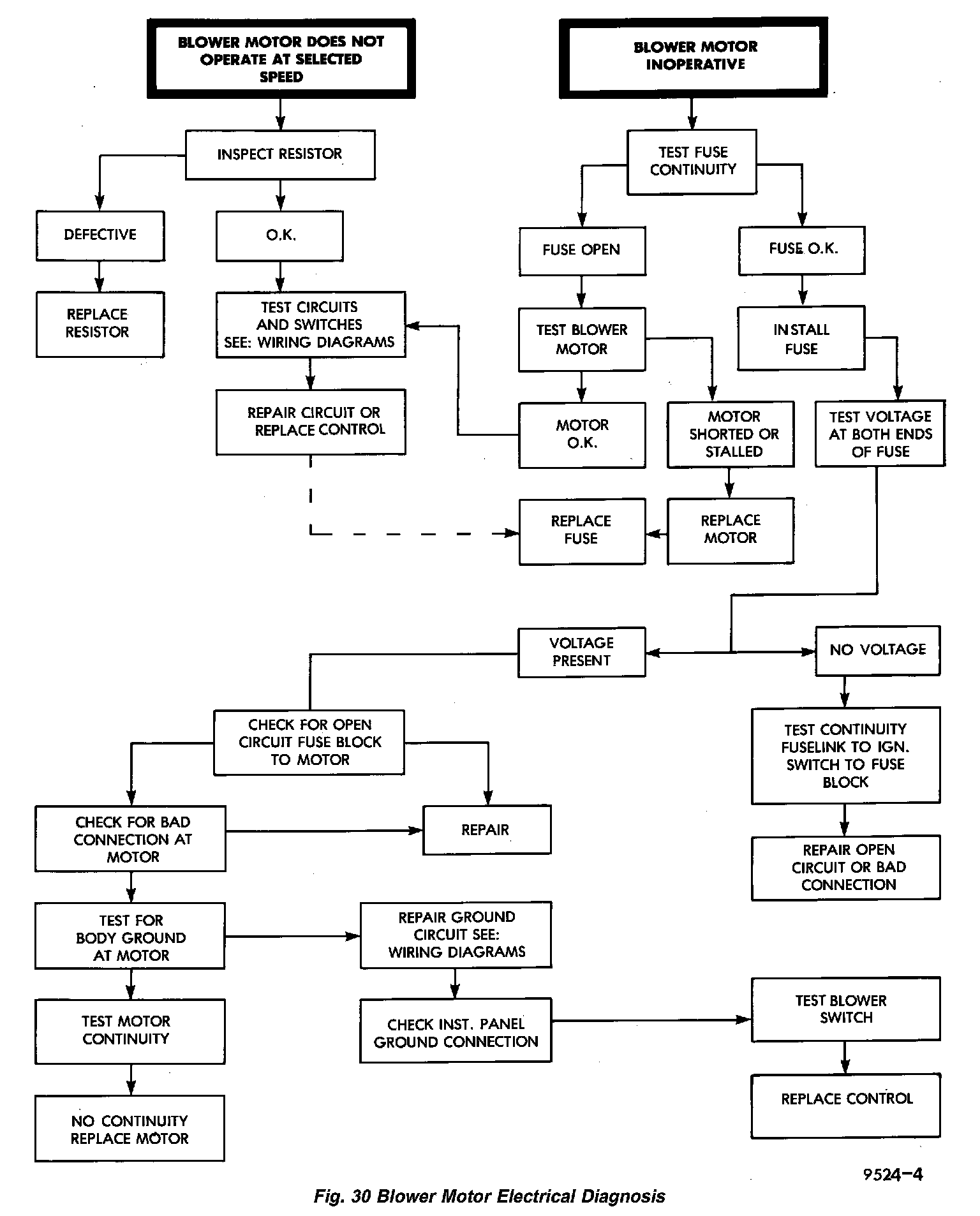 For circuit descriptions and diagrams, refer to the appropriate wiring information. The wiring information includes wiring, diagrams, proper wire and connector repair procedures, further details on wire harness routing and retention, as well as pin-out and location views for the various wire harness connectors, splices and grounds. The following chart will give you a basic check list on the blower motor circuit.