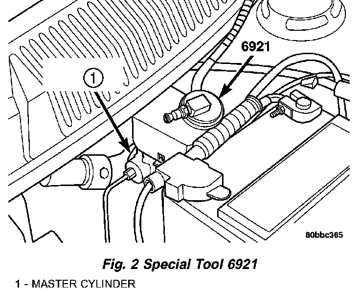 1. Attach Adapter, Special Tool 6921, to the master cylinder reservoir.