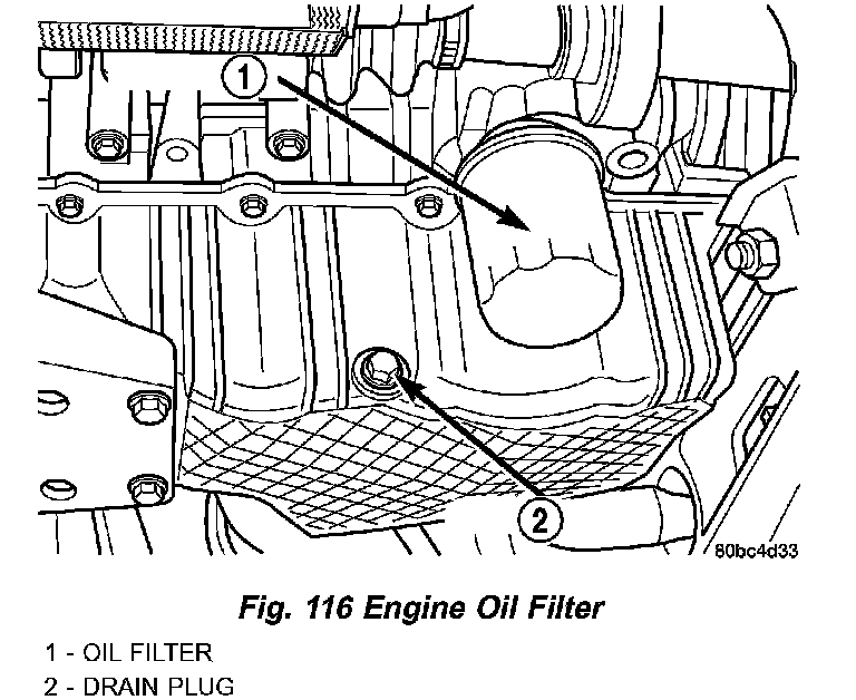 CAUTION: When servicing the oil filter (Fig. 116), avoid deforming the filter. Use an appropriate oil filter removing tool. Position filter wrench strap close the seam at the base of the filter. The oil filter seam that joins the can to the base, is reinforced by the base plate.