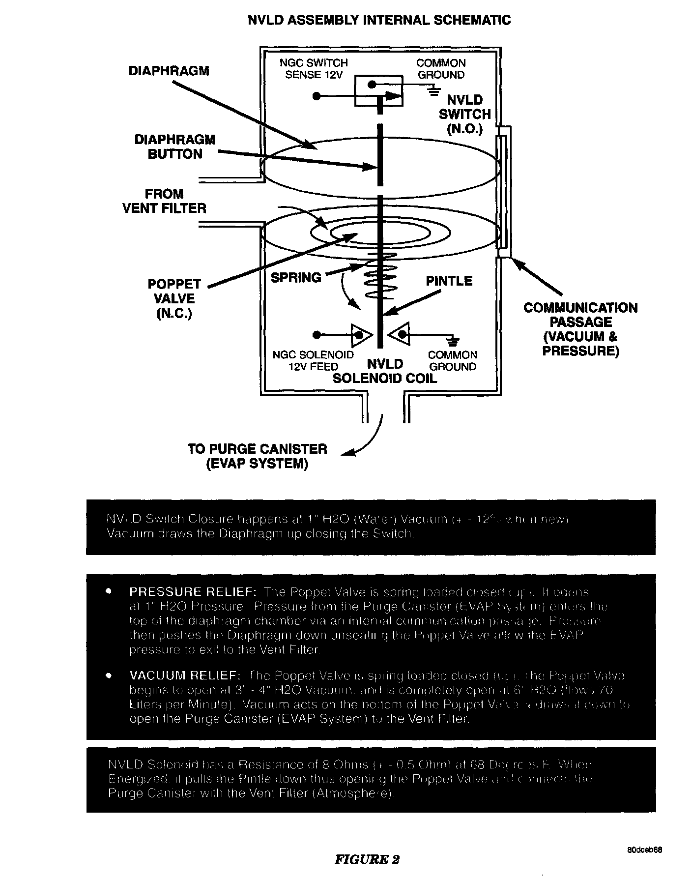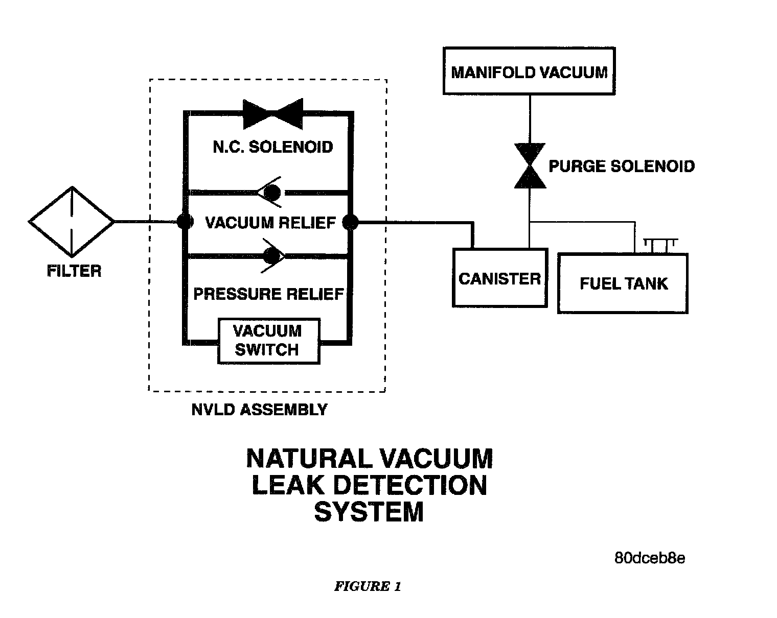 The Natural Vacuum Leak Detection (NVLD) system is the next generation evaporative leak detection system that will first be used on vehicles equipped with the Powertrain Control Module (PCM) or Next Generation Controller (NGC) starting in 20O2 M.Y. This new system replaces the leak detection pump as the method of evaporative system leak detection. The current CARB requirement is to detect a leak equivalent to a 0.O20" (0.5 mm) hole. This system has the capability to detect holes of this size very dependably.
