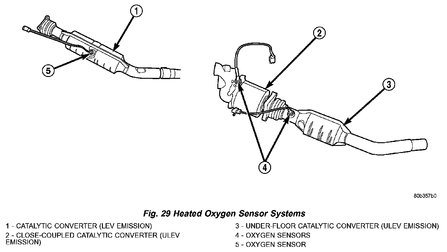 The downstream heated oxygen sensor threads into the system depending on emission package. Federal package the O2S is mounted after the catalytic convertor, LEV package the O2S is mounted mid catalytic convertor, ULEV package is mounted between the catalytic convertor.