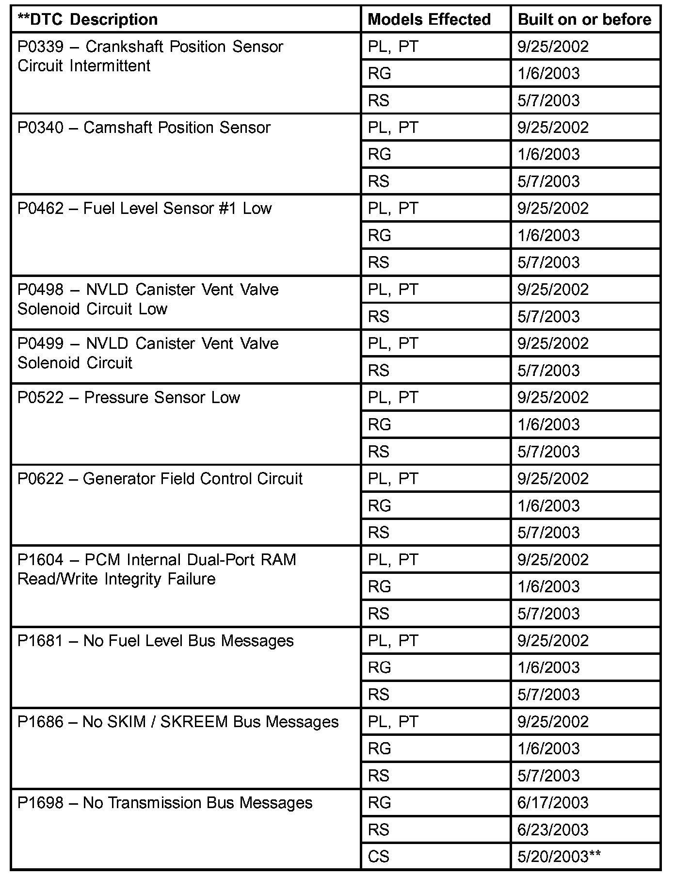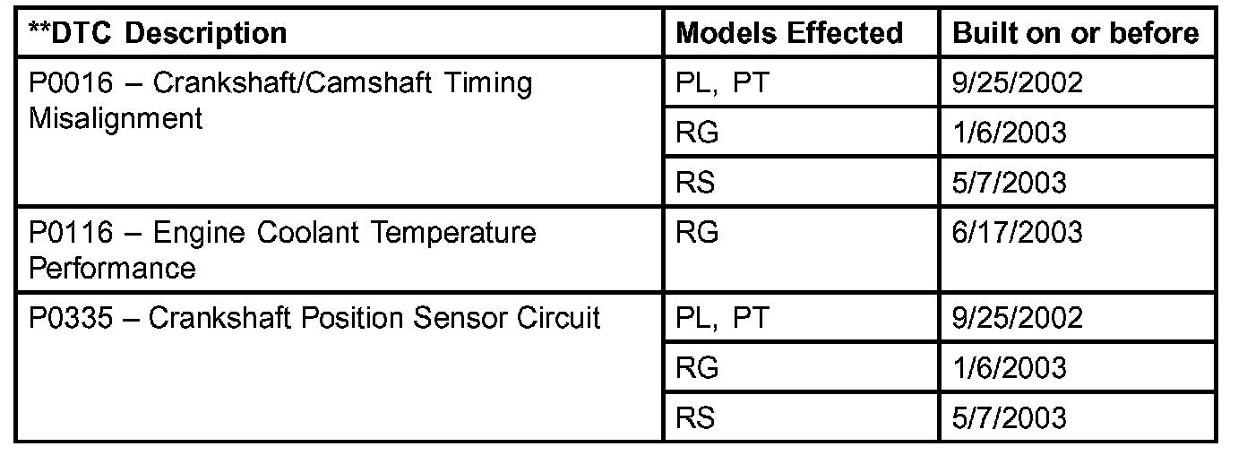 **This bulletin applies to RS and RG vehicles equipped with a 2.4L engine (sales code EDZ) and all CS, PL and PT vehicles built before date indicated below.**