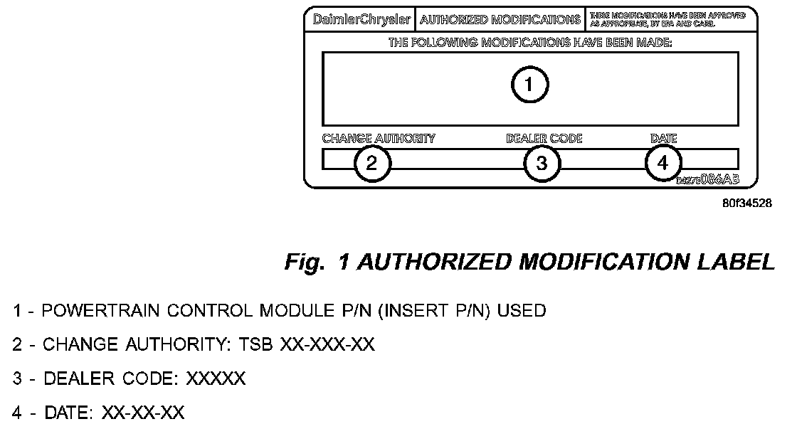23. Type the necessary information on the "Authorized Modification Label p/n 04275086AB and attach near the VECI label (Fig. 1).
