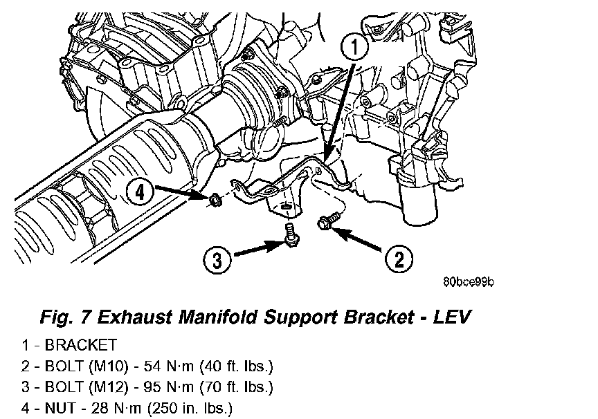2. Install exhaust manifold support bracket (LEV only). Tighten M10 bolt to 54 Nm (40 ft. lbs.), M12 bolt to 95 Nm (70 ft. lbs.), and nut to 28 Nm (250 in. lbs.).