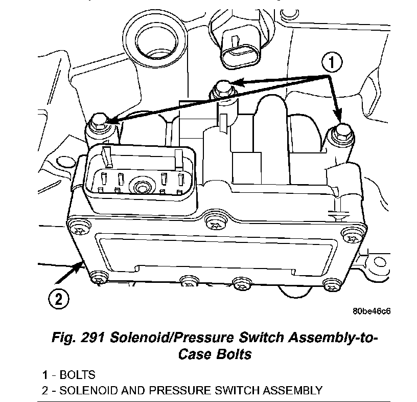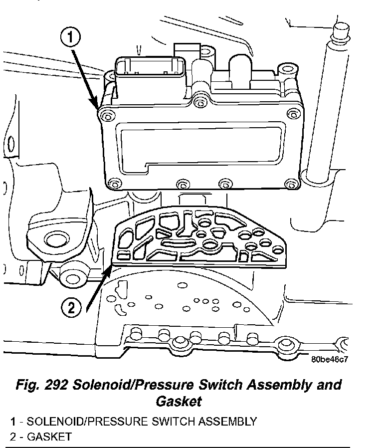 7. Remove solenoid/pressure switch assembly and gasket (Fig. 292). Use care to prevent gasket material and foreign objects from become lodged in the transaxle case ports.