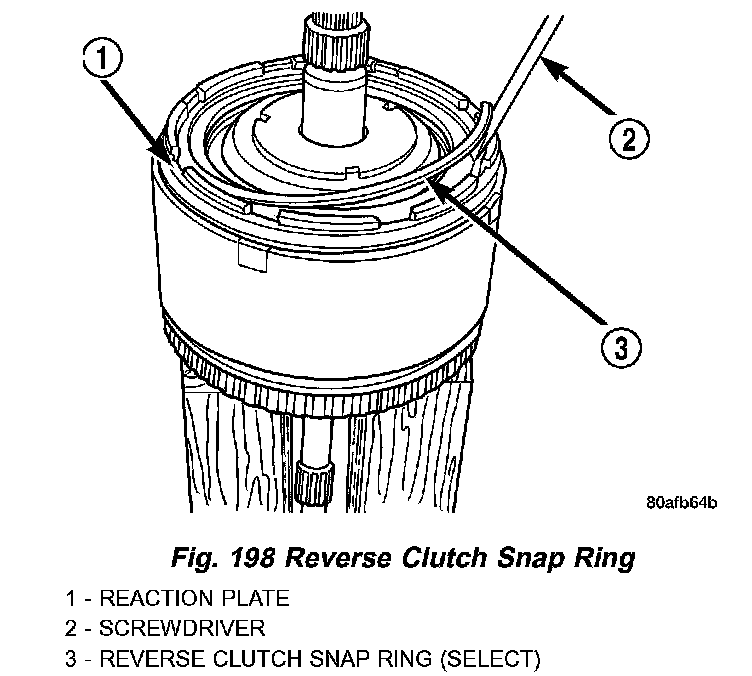2. Tap down reverse clutch reaction plate to release pressure from snap ring (Fig. 197).