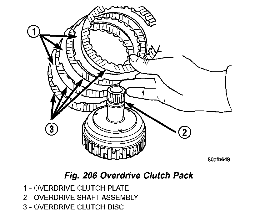 9. Remove OD shaft/hub and OD clutch pack (Fig. 205) (Fig. 206).